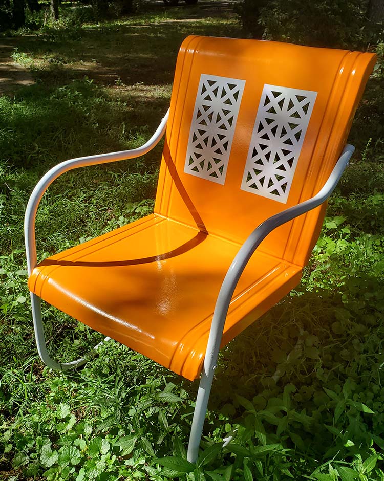 A restored metal chair, split colors of Orange and light gray.